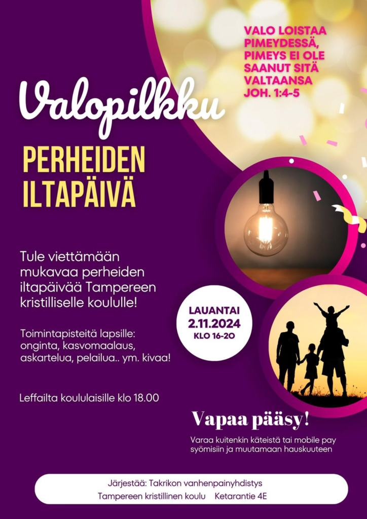 Tämä tapahtuma on Takrikon vanhempainyhdistyksen järjestämä. Se on suunnattu perheille. Juhlitaan ja riemuitaan valosta ja hyvyydestä!